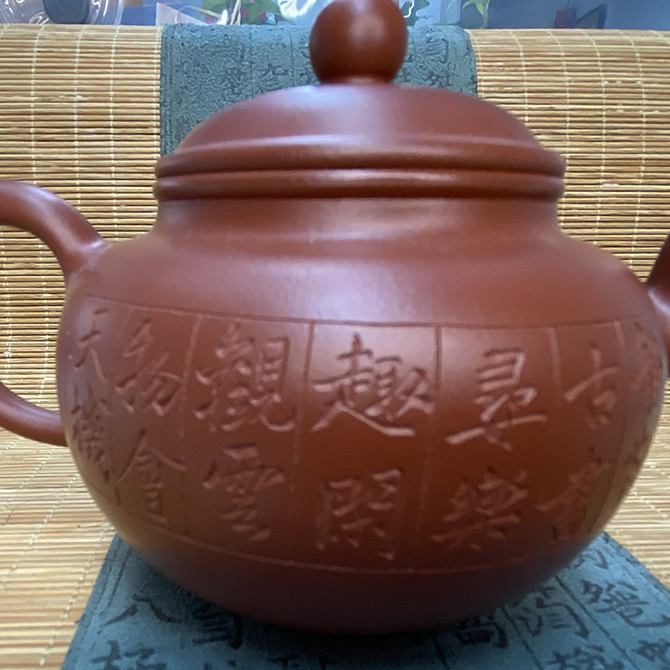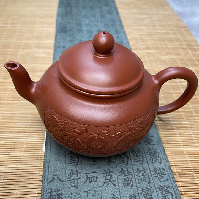 おめでたい赤の「紫砂赤泥壺」の表面には縁起物の龍が二頭彫刻され、さらに裏面には漢詩が彫刻されています。