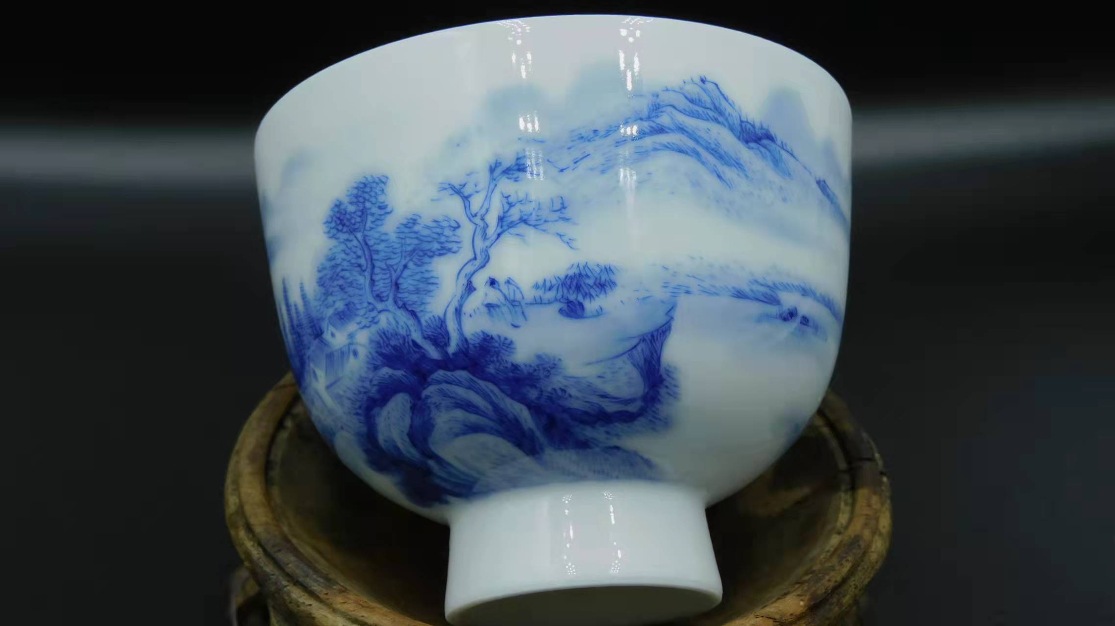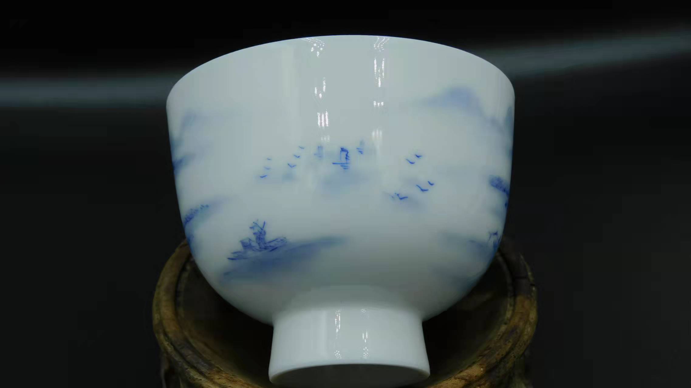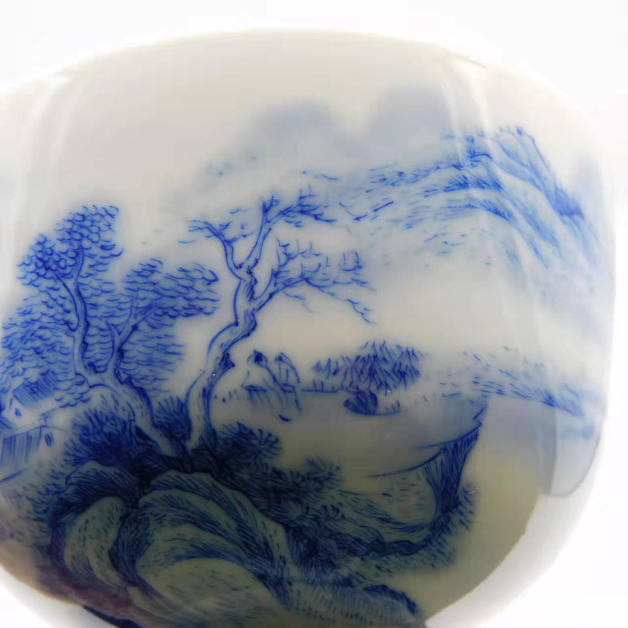 少し大きめの茶器のため日本茶に向いています。こちらは、景徳鎮を手掛ける技術の高い職人さんによって作られた茶器です。全て手描きされた絵柄はまるで山水画のような美しさを放っています。松の下で遠い山を愛でる二人の詩人、そして雲に向かって飛んでいく鳥を眺めながらゆっくりと船を進める船頭が描かれています。陶磁器の中でも最も技術の高い「藍色一色」で染められた天と地と自然の風景は、中国でも入手困難な茶器となっています。