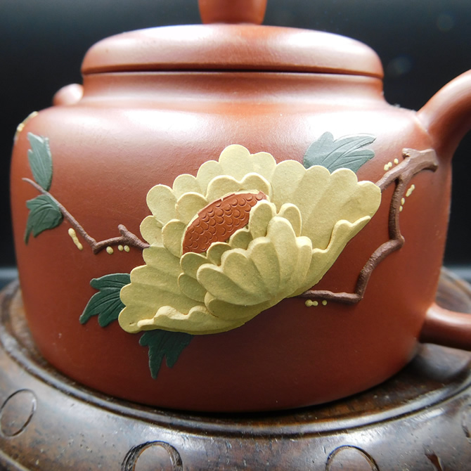 立体的な花と蝶に彩られた豪華絢爛な紫砂壺は、見ているだけも楽しめる逸品です。